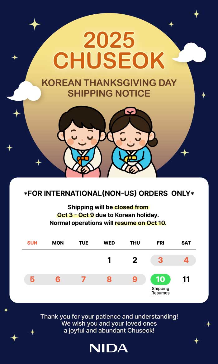 Shipping will be closed from Oct 3 - Oct 9 due to Korean holiday. Normal operations will resume on Oct 10.