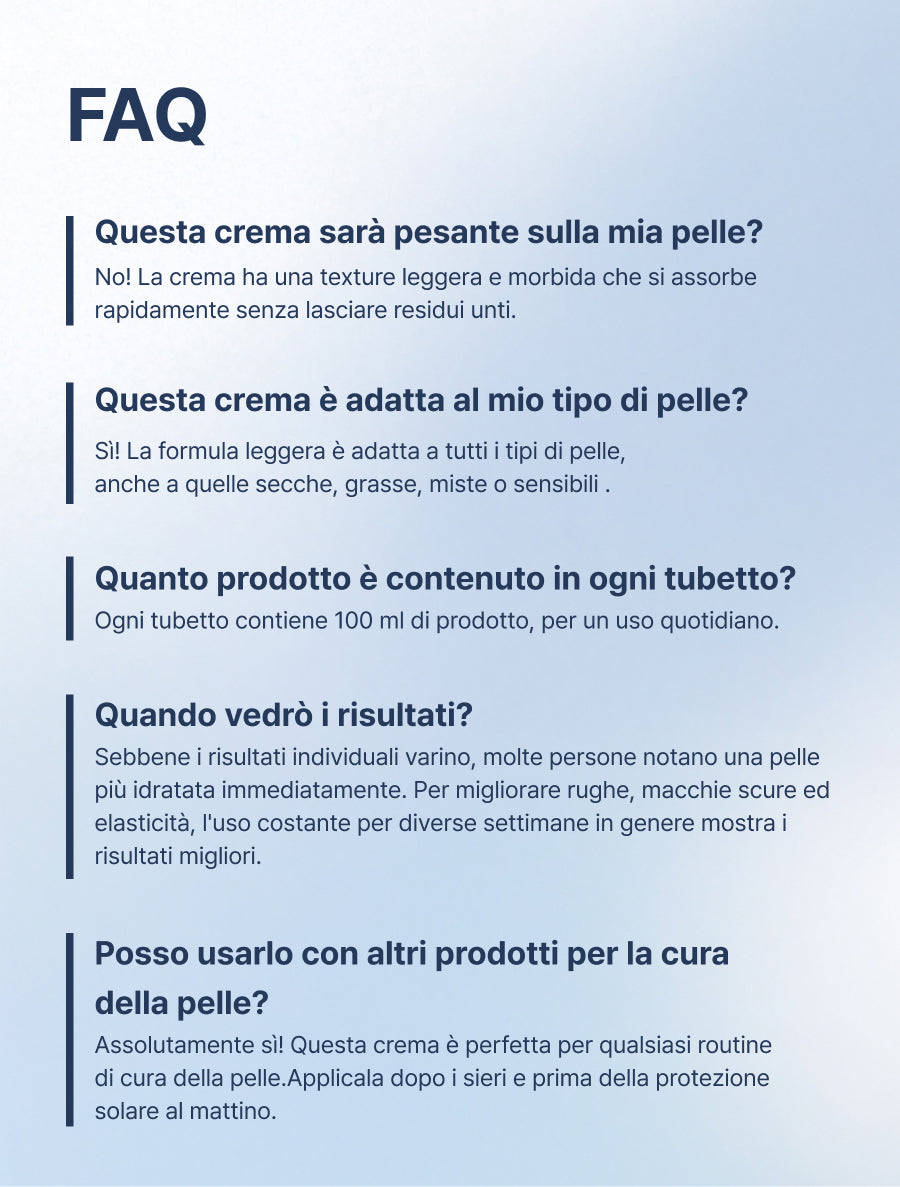Siamo sicuri dei nostri prodotti. Se il nostro prodotto non è adatto alla tua pelle o non sei soddisfatto, offriamo una garanzia di rimborso del 100%*.